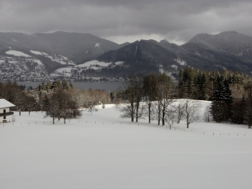 Gegen 14.00 Uhr traten wir dann den Rückweg an. Dieser führte uns, nachdem der Schneefall etwas nachgelassen hatte, über den Westhang des Hirschberges zurück nach Bad Wiessee, wobei wir noch mit einem wunderschönen Blick auf den Tegernsee und seine wolkenverhangenen und verschneiten Berge belohnt wurden.