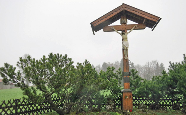 Hier zweigte auch unser Wiesenweg rechts ab zu einem Gedenkkreuz und weiter hinunter zur Stadlbergalm.