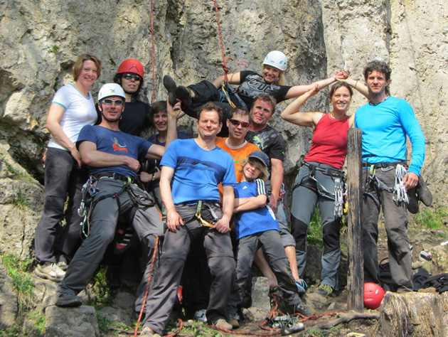 Gegen 16:00 Uhr neigte sich das erlebnisreiche Wochenende dem Ende zu. Ein letztes Actionfoto zur Dokumentation und die anschließende Abschlussbesprechung unter einer riesigen Linde – Constanze (Naturschutzreferentin der Sektion) meinte, die ist bestimmt 300-400 Jahre alt – war das Finale des Kurses ‚Klettern am Felsen’. Alle fanden das Wochenende super und wir haben wieder einmal viel von unseren Guides gelernt.