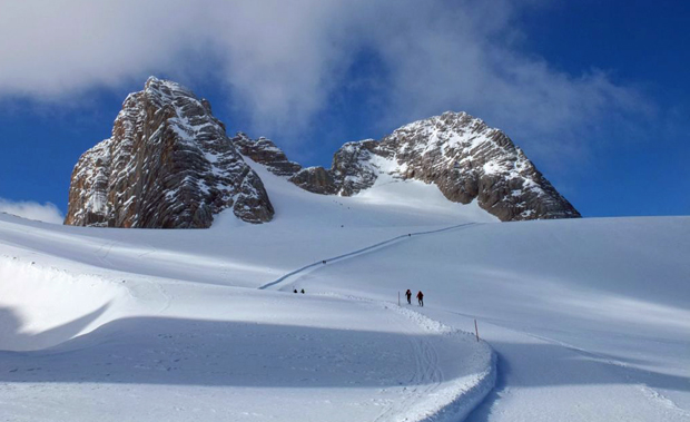 So machten wir uns bei einen Wechselspiel aus Sonne und Wolken auf den Weg durch diese schneebedeckte Karstlandschaft. Gegen Mittag erreichten wir den höchsten Punkt unserer Tour, die Hunerscharte, 2.602 m. Endlich durften wir auch einen Blick werfen auf den Hohen Dachstein mit seinen 3.000 m.