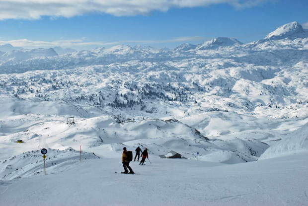 Nun war ja nicht Freeriding, sondern Skitouren ausgeschrieben, so mussten schon auch ein paar Höhenmeter her. Mit der Seilbahn schwebten wir also vom – grünen – Obertraun (540 m) auf den weißen Kippenstein (2.108 m). Dort eröffnete sich uns eine ganz ungewohnte Welt. Vor uns lag das Dachsteinplateau mit seinen zahlreichen Erhebungen, wie eine Hügellandschaft, im Süden begrenzt durch die Felsgipfel des Hohen Dachsteins und des Koppenkarsteins.