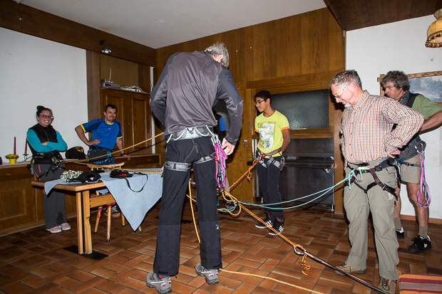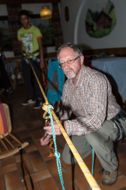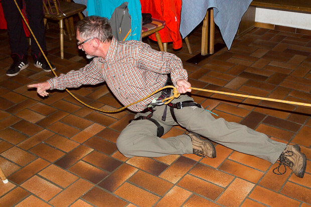 Zurück am Tauernhaus nutzen wir die Zeit, um im Trockenen (draußen regnet es unglaubliche Mengen) die Spaltenbergung zu üben. Es ist ja immer gut, wenn bei einem Sturz alle Mitglieder einer Seilschaft die Abläufe beherrschen, um die gestürzte Person wieder aus der Spalte zu holen.