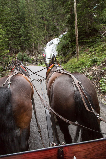 Wir beladen mit unserem Kutscher Mario das Gefährt und fahren los Richtung Innergschlöß. Wir haben es ja nicht eilig und wollen etwas von dem schönen Tal sehen. Leider beginnt es aber während der Fahrt wieder zu nässeln, was den Genuss doch etwas trübt.