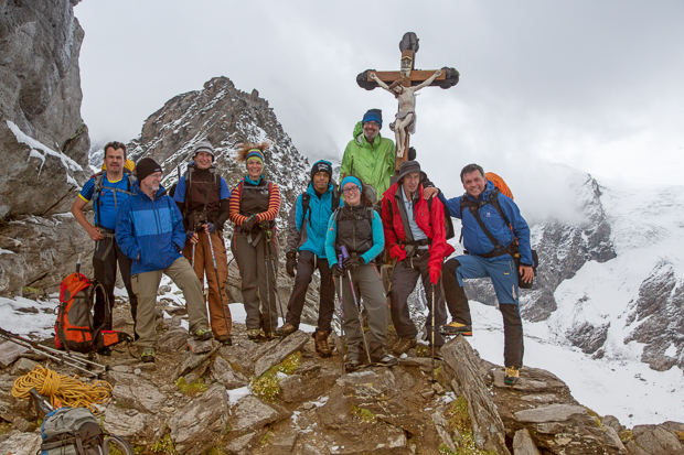 Zufällig ist auch grade ein weiterer Bergsteiger oben, so dass wir uns als Gruppe fotografieren lassen können. Andererseits: Er ist ein Rheinländer. Also Textprobe garantiert, wie Karola erfahren muss.
