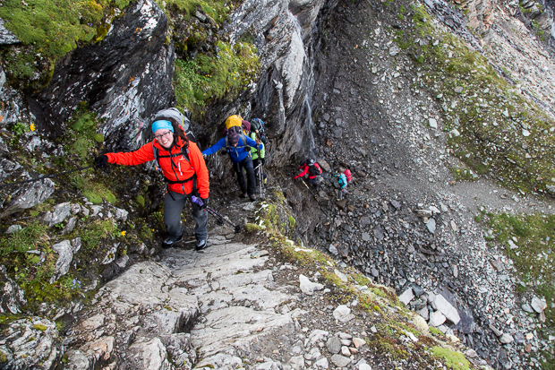 In stetigem Auf und Ab geht es jetzt der Badener Hütte zu und die immer wieder eingestreuten versicherten Stellen machen Kletterspaß. Dass der Weg nicht in direkter Linie, sondern durch viele Rinnen hinein und wieder hinaus führt, macht der Gruppe praktisch nichts aus, und so erreichen wir gut gelaunt die Hütte. Dort erwarten uns ein eigenes Lager (nur möglich, weil wegen des Schlechtwetters viele abgesagt haben, so wie wir am Vortag auch) und eine Dusche – super!