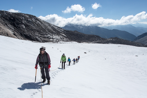 Der Sonntag begrüßt uns tatsächlich schon mit gutem Wetter, so dass wir nach dem Frühstück gleich mit dem Aufstieg beginnen können. Zunächst über die Moräne hinauf, dann ein kurzes Stück hinunter zum Gletscher (der wie alle Alpengletscher in den letzten Jahren arg gelitten hat). Wir seilen uns an und gehen in den eingeteilten Seilschaften los, als Seilerste jeweils die Tourenleiter Karola und Hans.