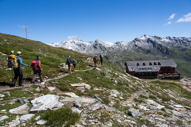 Über die Moräne führt uns der Weg dann vorbei am Trinkwasserreservoir wieder zurück zur Badener Hütte. Dort kehren wir nochmal kurz auf ein Getränk ein, ziehen uns um und packen die Rucksäcke für den Abstieg.