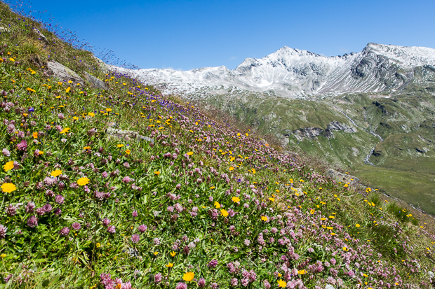 Dieser Abstieg führt uns über viele Höhenmeter hinunter durch das Frosnitztal, vorbei an wunderbaren Blumenwiesen.