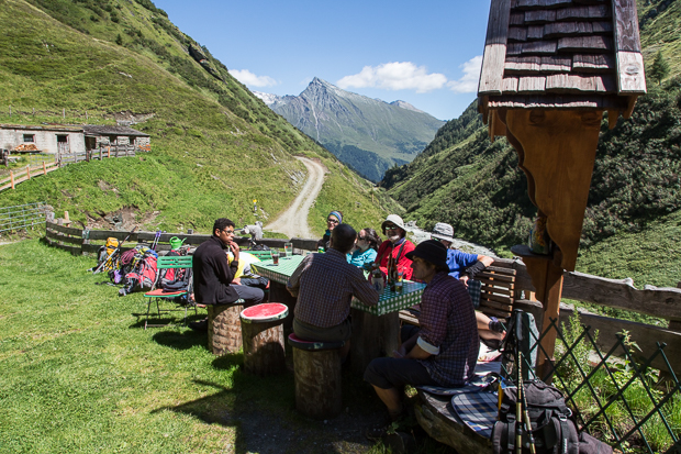 Gut, dass es nicht weit unterhalb eine weitere Möglichkeit zur Einkehr gibt, nämlich beim „Reisinger“. Dort sitzen wir sehr schön und werden von den netten Wirtsleuten auch gut bedient. Nur die Preise sind nicht so wirklich almmäßig …