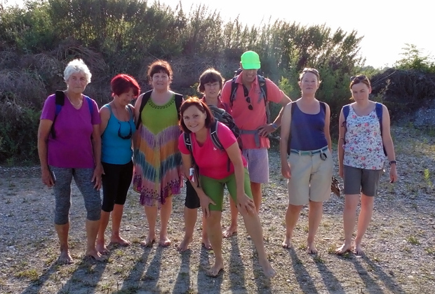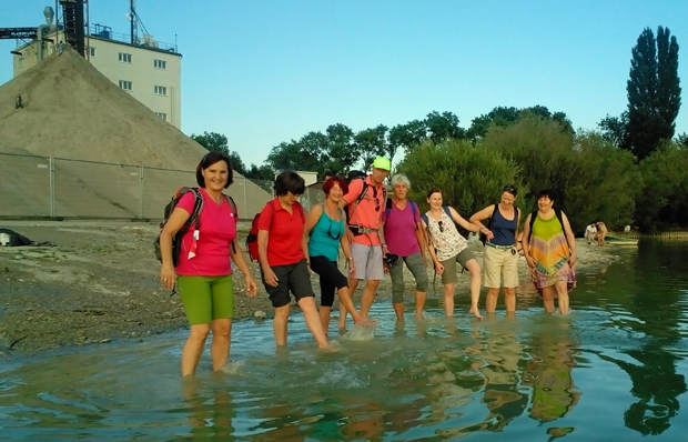 Junge Leute, die rund um den Weiher lagen, wurden neugierig und versuchten es ebenfalls ein kleines Stück. Ein Übermütiger wollte sogar mit aufs Gruppenfoto. Noch ein neues DAV-Mitglied? Wir gingen weiter und stießen auf kleine Sandhügel, die sehr angenehm für die Füße waren. Dann wieder feiner Kies mit unangenehm eckigen Kanten.