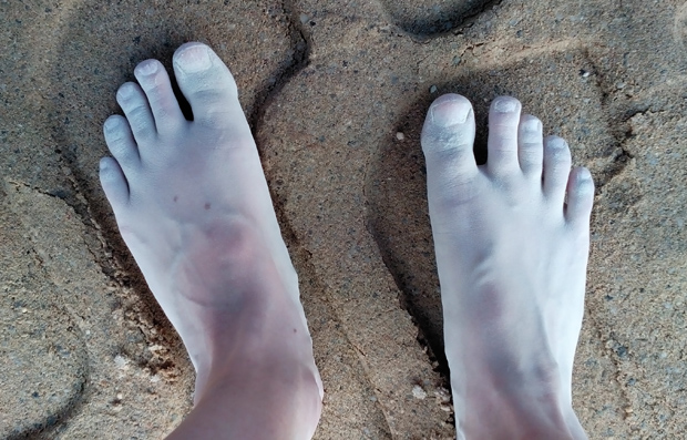 Dann wurden die Fußsohlen fotografiert, um die Farbveränderungen nach dem Wandern vergleichen zu können. Jetzt ging‘s aber los. Sanft spazierten wir einen grasigen Pfad entlang. Das war recht angenehm. Fast fühlte es sich kühl und feucht an, aber nein – es war trocken, das Gras.