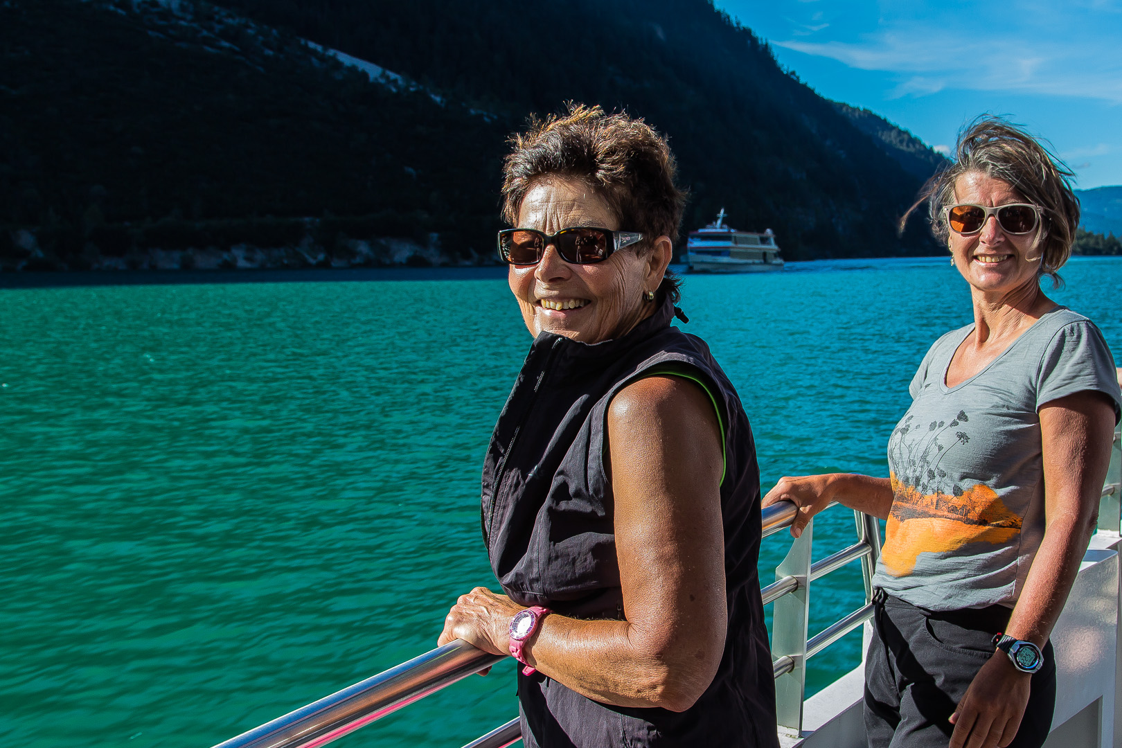 Nach einer weiteren Erholungspause (nicht, dass die jemand benötigt hätte) führte der Steig dann im Fels, später über wunderschöne Wiesenhänge, allmählich dann auch mit lichtem Baumbestand hinunter nach Pertisau, das gegen 16:30 Uhr erreicht wurde. Die Rückweg-Variante war nach dieser langen Tour bereits vorprogrammiert; Tickets für die Achenseeschifffahrt waren gleich erstanden und es blieb noch Zeit für einen Durstlöscher im benachbarten Biergarten (natürlich mit einem erheblichen Achensee-Tourismus-Aufschlag). Es braucht nicht erwähnt zu werden, dass die Rückfahrt den krönenden Abschluss der heutigen, bei Traumwetter erlebten Tour bildete.