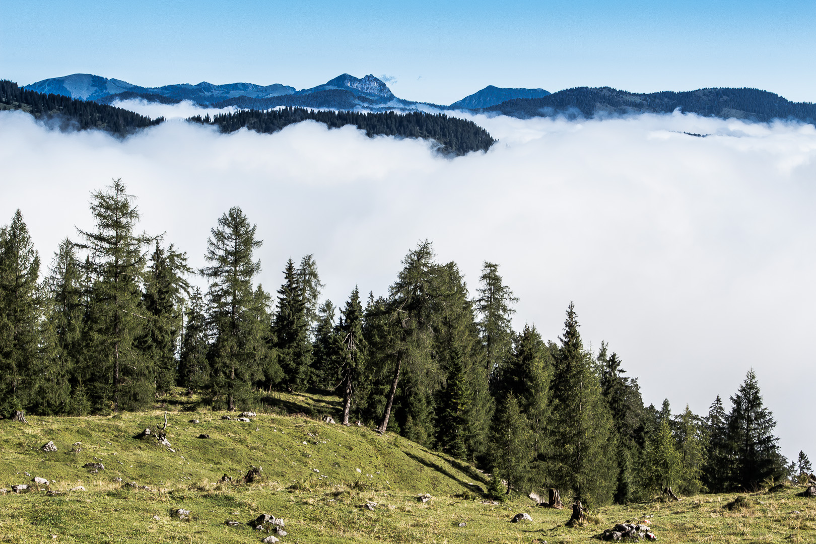 Durch den Bergwald (recht dampfig war´s, schlecht für Brillenträger, die sahen nämlich nur noch alles stark vernebelt – und das ohne Alkoholgenuss) führte der Steig zur Seekaralm. Dort angekommen ließ sich auch die Sonne nicht lang bitten; während unten im Tal noch alles in Watte gehüllt war, tauchten schon die ersten Berge der Vorgebirgskette auf.