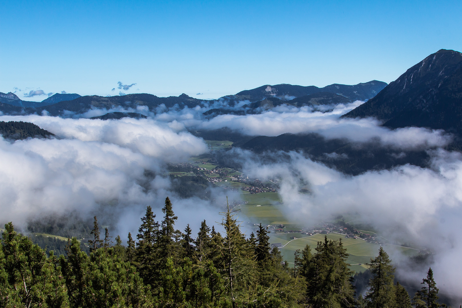 Vorerst durch Latschenfelder, dann im freien Gelände führte der weitere Weg Richtung Seekarspitze, die Nebelfelder im Tal lichteten sich, Achenkirch und das Südende des Achensees wurden sichtbar.