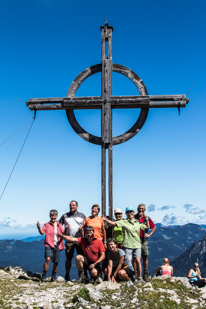 Noch ein paar Mal kurz an den Fels hinlangen, und dann war das Gipfelkreuz der Seekarspitze (2.053 m) auch schon erreicht,
