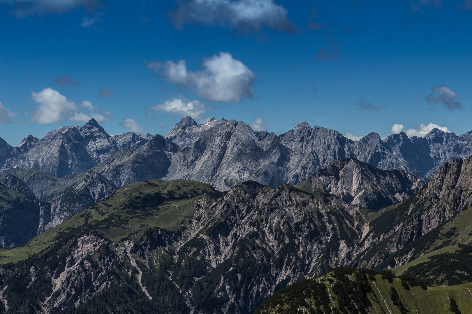 Trittsicherheit und Konzentration waren schon erforderlich auf dem weiteren Gratweg (zur Linken immer den steil abfallenden Hang Richtung Achensee) zur Seebergspitze. In stetigem Auf und Ab ging es (zuerst tendenziell mehr bergab, später wieder mehr z. T. recht steil bergauf) hinüber auf den zweiten heutigen Gipfel (2.085 m).