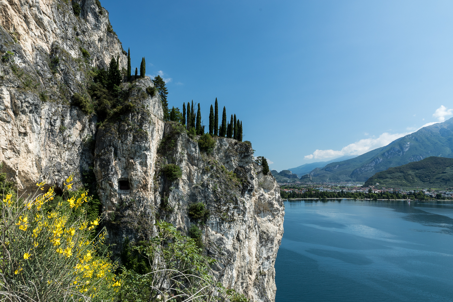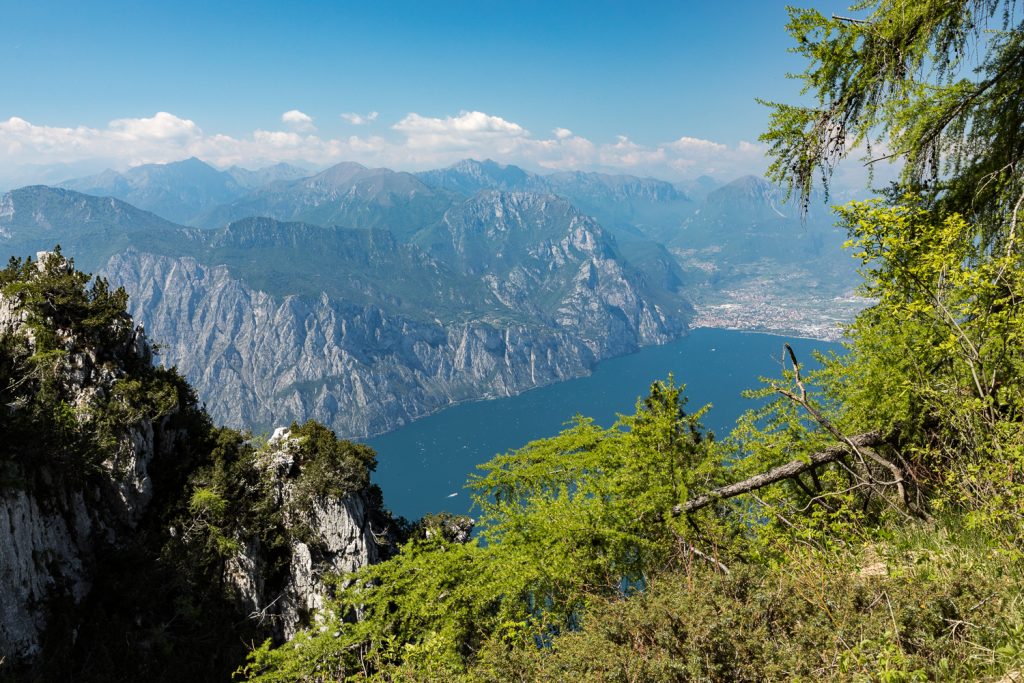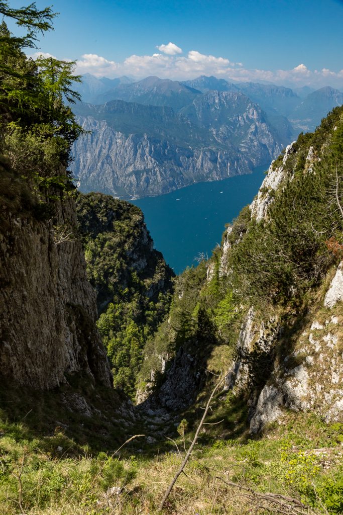 Jetzt beginnt der alpinistisch interessanteste Teil unserer Tour: Die Wanderung unterhalb der Felsabstürze der Cima di Ventrar. Tolle Ausblicke auf den Lago wechseln sich hier mit durchaus ausgesetzten Stellen ab, bei denen man den Blick besser gut auf den Weg gerichtet hält.