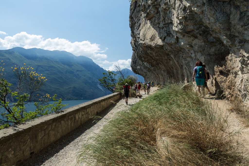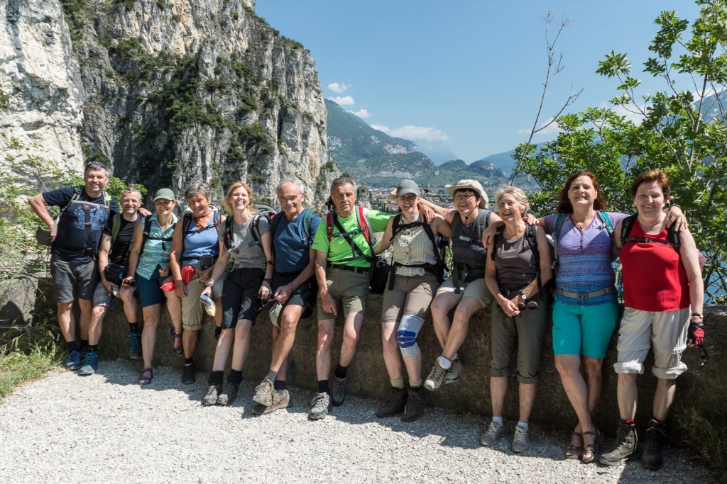 Nach erneut sehr vielen Kurven treffen wir uns mit Alex, Petra und Sonja, die neu dazukommt, im Parkhaus in Riva. Von dort aus wandern wir zum Einstieg in die Ponale-Straße, die vor dem Bau des Tunnels die Verkehrsverbindung hinauf zum Ledro-See darstellte. Heute kaum noch vorstellbar, dass man (so wie der Tourenleiter) hier einmal mit dem Auto hinauf gefahren ist …