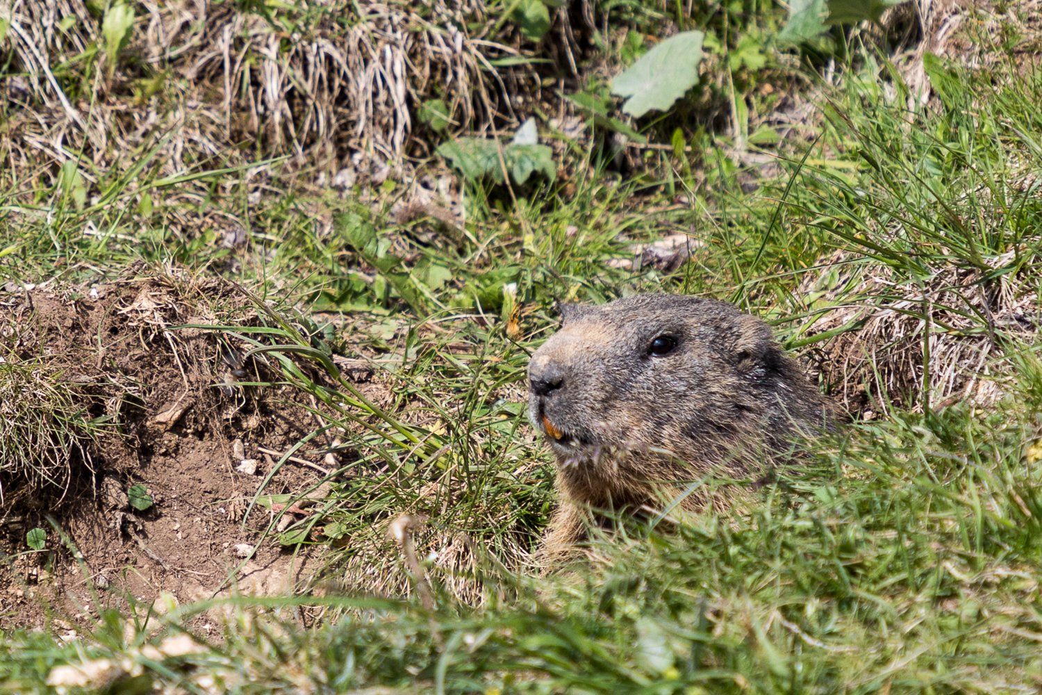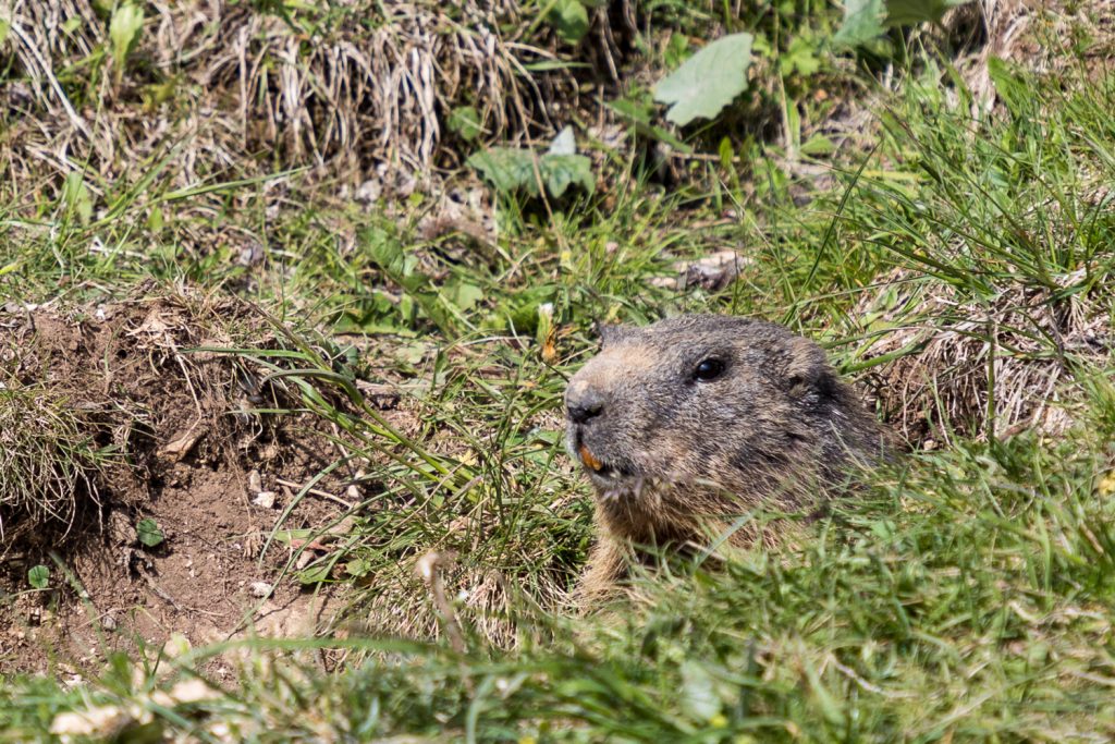 Der Samstag beginnt wieder mit Wolken, aber wir sehen auch blauen Himmel. Heute können wir es also wagen, auf dem Gipfelkamm zu wandern. Wir fahren ein kurzes Stück und stellen unsere Autos am Wanderparkplatz ab. Von dort geht es nun hinauf auf die Cima di Ventrar. Gleich zu Beginn begrüßt uns ein Murmeltier zu unserer Wanderung.