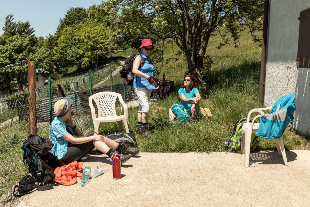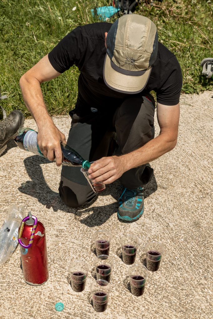 So machen wir es uns an einem kleinen Häuschen gemütlich – und werden überrascht: Alex hat feinen Roten mit heraufgebracht, den wir uns jetzt zur Brotzeit munden lassen. Prosit, Alex!