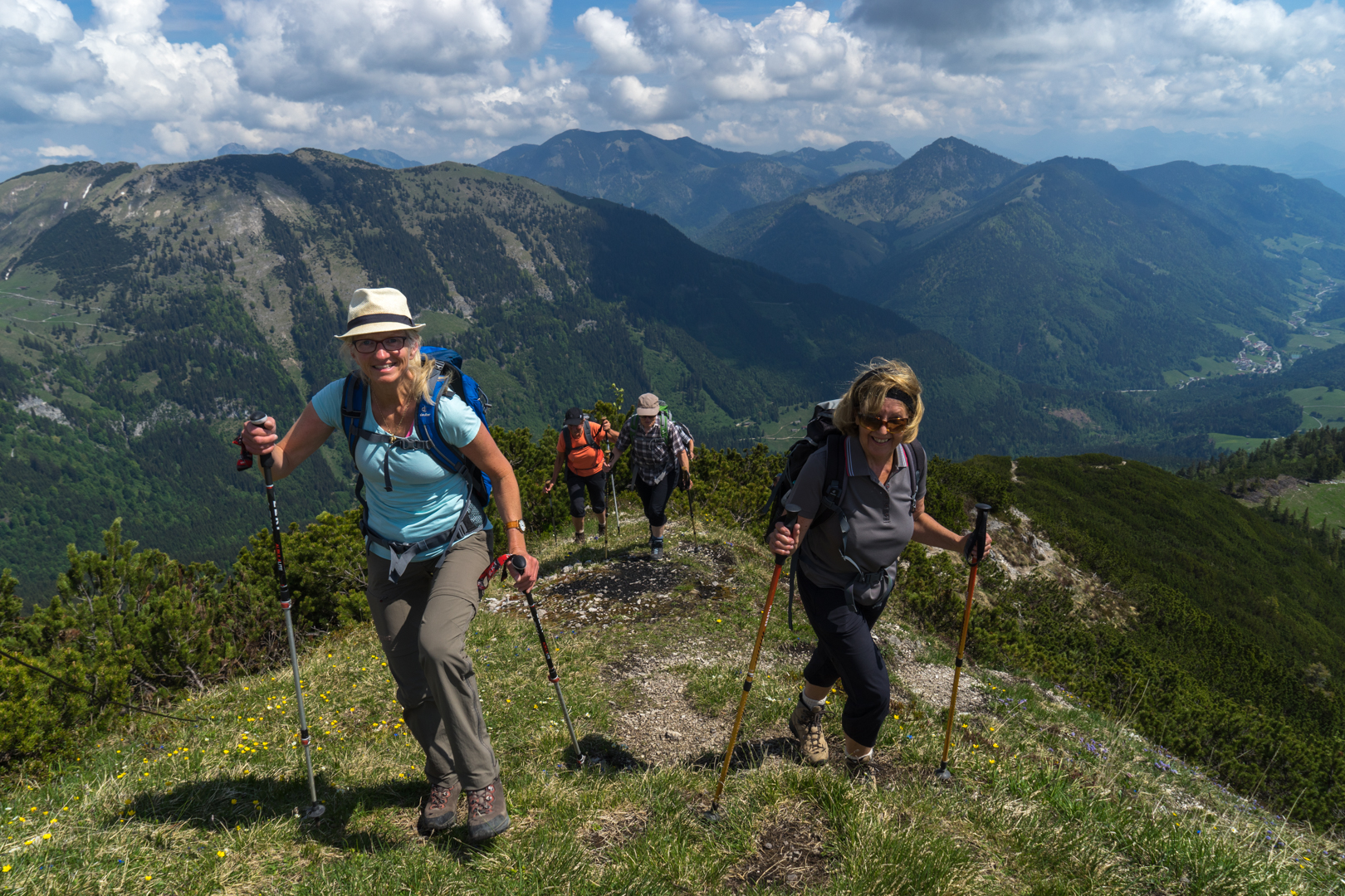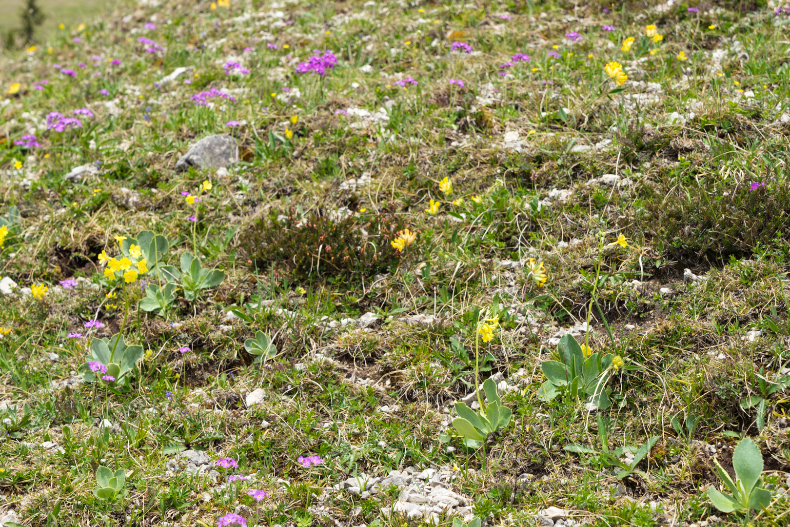 Abstieg in Richtung Thalerjoch und Frechjoch und dann steil bergab in Richtung Riedebenalm. Unterwegs gibt es auf den Almwiesen viele Bergblumen zu sehen, wie Aurikel, Mehlprimel, Frühlingsenzian, Soldanelle, Kugelblume und viele mehr. Resi kennt sich mit den Bergblumen am Besten von uns aus und gibt ihre Kenntnisse gerne an uns weiter.