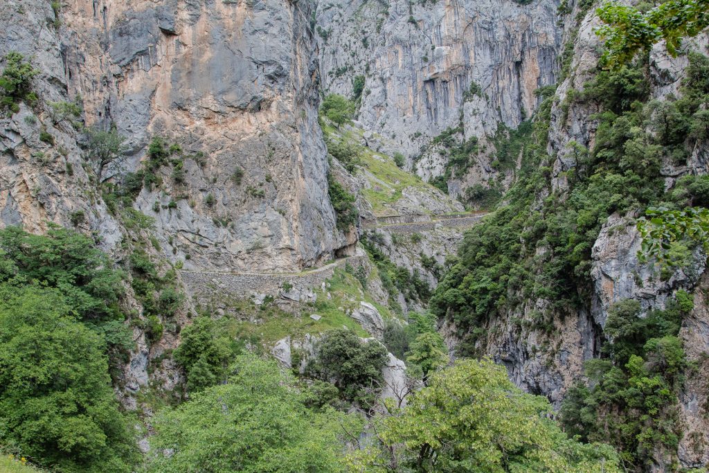 Dort stärken wir uns und wandern am Nachmittag durch die 12 km lange Cares-Schlucht talauswärts nach Poncebos, der Rest der Gruppe ist bereits am späten Vormittag gestartet. Der Rio Cares hat sich eng und tief zwischen das West- und das Zentralmassiv der Picos de Europa eingeschnitten. Der gute Weg wurde stellenweise aus den senkrechten Schluchtwänden herausgehauen und erlaubt ohne jegliche Absicherung Tiefblicke auf den bis zu gut 100 m unter uns dahinrauschenden Fluss.